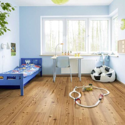 Deep golden tones with bold knot structure and expressive grain that increases visual weight and surface movement. Tactile variation that feels grounded underfoot and reads as natural depth across the room.