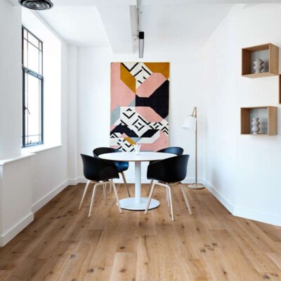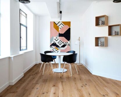 A rich tobacco tone with expressive grain structure that increases visual weight and defines the floor plane with architectural authority. Natural variation that reads as depth rather than decoration.